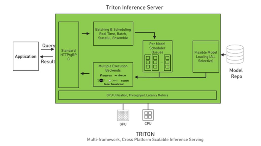 NVIDIA Triton은 데이터센터와 클라우드, 임베디드 디바이스 일체에 표준화되고 확장 가능한 프로덕션 AI를 제공합니다. 다중의 프레임워크를 지원하고, CPU와 GPU 모두에서 모델을 실행하며, 다양한 유형의 추론 쿼리를 처리하고, 쿠버네티스, MLOPs 플랫폼과 통합됩니다.