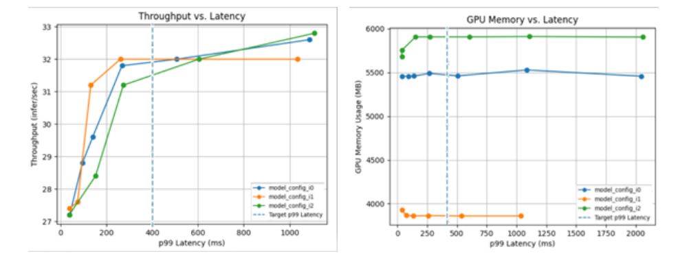 Triton Model Analyzer는 이 선택을 자동화하는 최적화 툴입니다. 모델이 최고의 성능을 달성할 수 있는 최선의 구성을 자동으로 찾아주죠. 지연 시간 제한, 목표 처리량, 메모리 풋프린트(memory footprint)와 같은 성능 요구 사항의 지정이 가능합니다. Triton Model Analyzer는 다양한 모델 구성을 검색하여 사용자의 제약 조건 하에서 최상의 성능을 구현하는 구성을 찾습니다. 상위권에 속하는 모델 구성들의 성능을 시각적으로 보여줄 수 있도록 차트가 포함된 요약 보고서를 제공합니다(Figure 2).