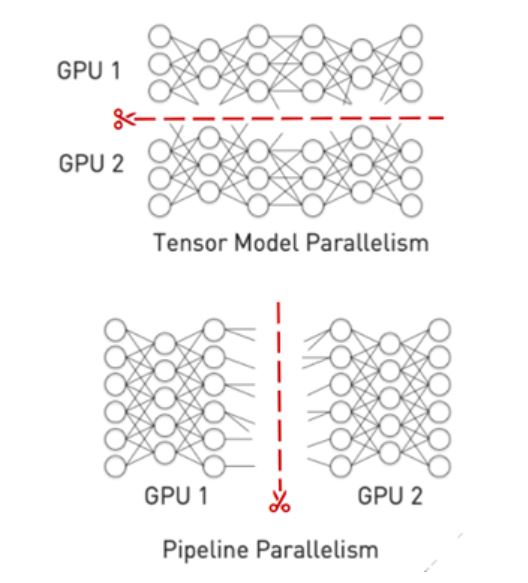 추론 작업을 위해서는 모델을 보다 작은 다수의 파일로 분할한 다음 각 파일을 별도의 GPU에 로드해야 합니다. 모델의 분할에는 일반적으로 두 가지 접근법이 사용됩니다.