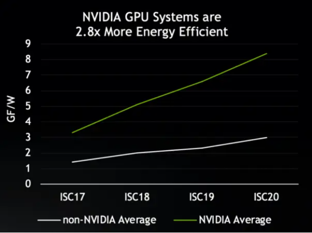 엔비디아 GPU를 사용하는 시스템은 에너지 효율 측면에서 우위를 차지하고 있습니다. 평균적으로 기가플롭/와트 단위로 측정 시 엔비디아 GPU를 장착하지 않은 시스템 대비 2.8배 높은 전력효율을 구현합니다. 이는 엔비디아 GPU가 현재 전세계 상위 500대 슈퍼컴퓨터 목록에서 상위 25대 슈퍼컴퓨터 중 무려 20대에 사용되는 이유이기도 합니다.