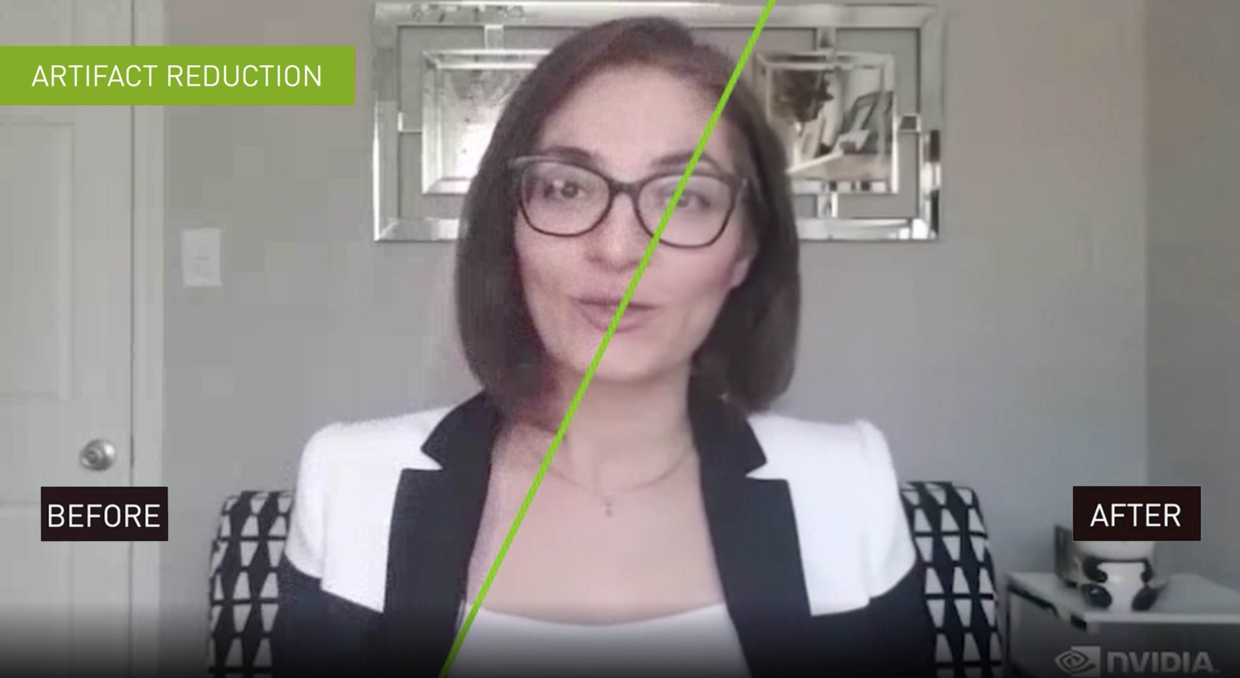 Maxine의 아티팩트 감소(Artifact Reduction, Figure 4) 기능은 화상 통화에서 대역폭이 줄어들 때 발생하는 블로킹 아티팩트를 줄여줍니다. 또한 링잉(ringing) 아티팩트와 모스키토 노이즈(mosquito noises)를 감소시키면서 원본 비디오의 디테일을 보존합니다.
