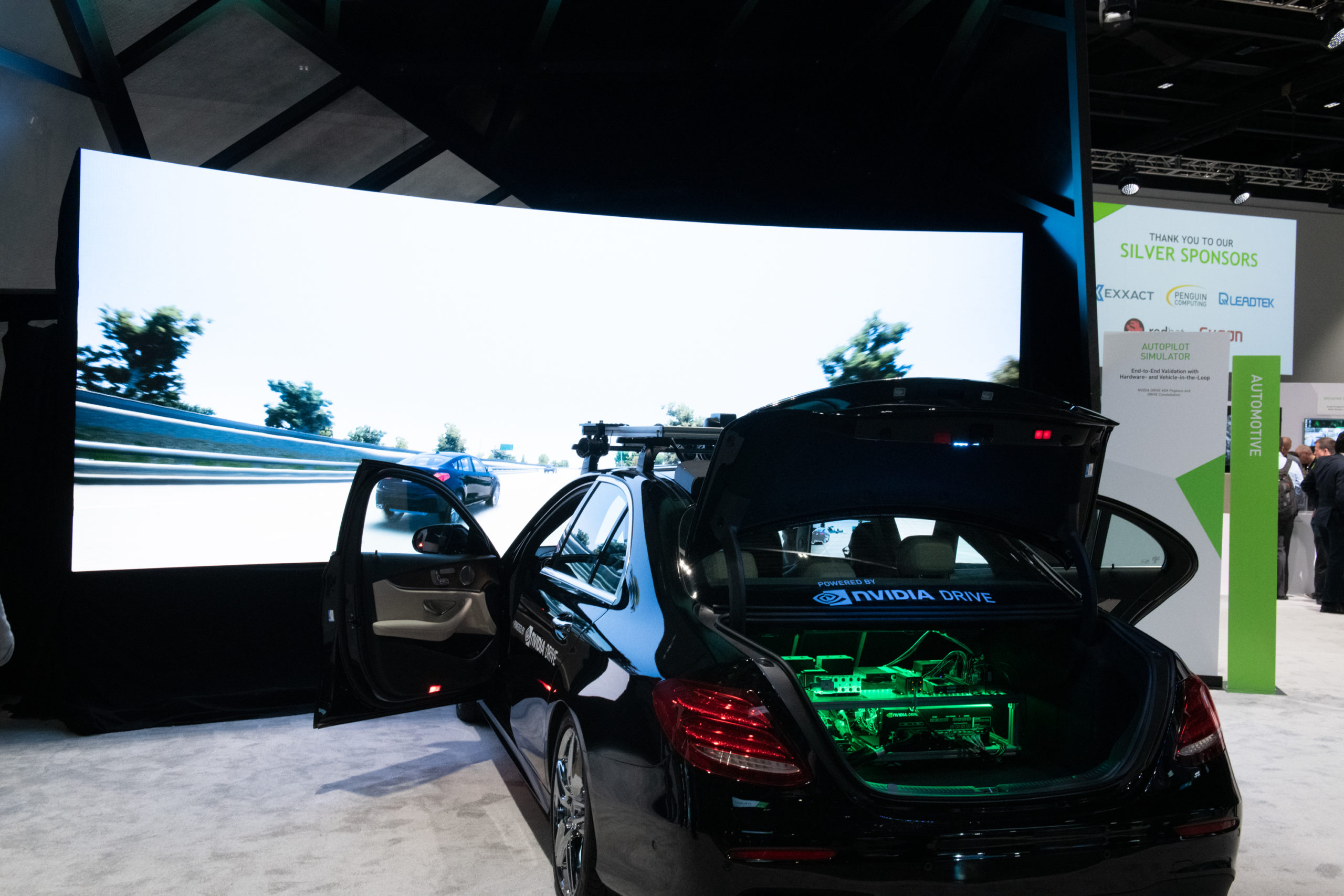 메르세데스 벤츠 E300으로 제작된 이 시뮬레이터에는 드라이브 AGX 페가수스(Pegasus) 슈퍼컴퓨터, 드라이브 AV 자율주행 소프트웨어, 드라이브 IX 지능형 운전석 플랫폼이 포함돼 있습니다. 이 차량은 DRIVE Constellation에 연결돼 있으며, 전방의 서라운드 비디오 스크린은 시뮬레이션 주행 중인 차량의 환경을 재생합니다.
